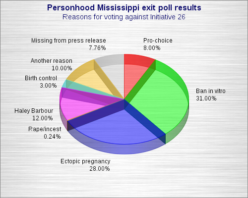 Furthermore, the closing paragraph mentions that of those polled, 24 voted against the initiative because of the lack of exceptions for victims of rape and incest. In the accompanying pie chart, this option is represented at 8 percent instead of the mathematically correct 1 percent, throwing off the entire graph.